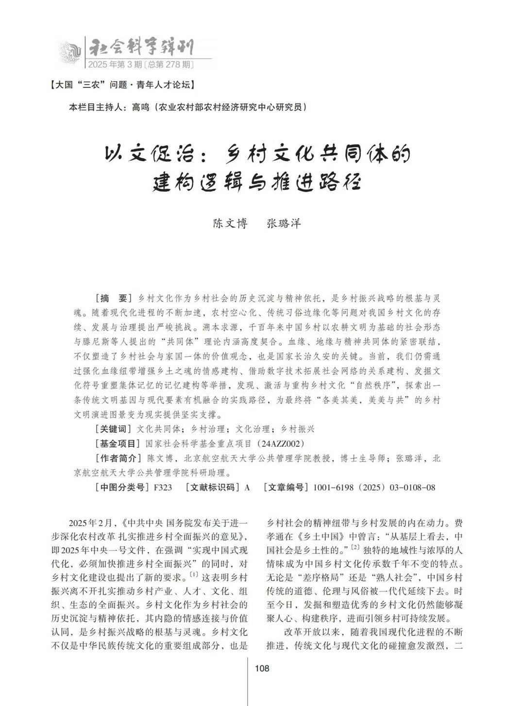 近日,北京航空航天大學人文社會科學學院(公共管理學院)陳文博教授、科研助理張璐洋在《社會科學輯刊》so米體育-NBAso米直播第3期發(fā)表《以文促治:鄉(xiāng)村文化共同體的建構(gòu)邏輯與推進路徑》一文